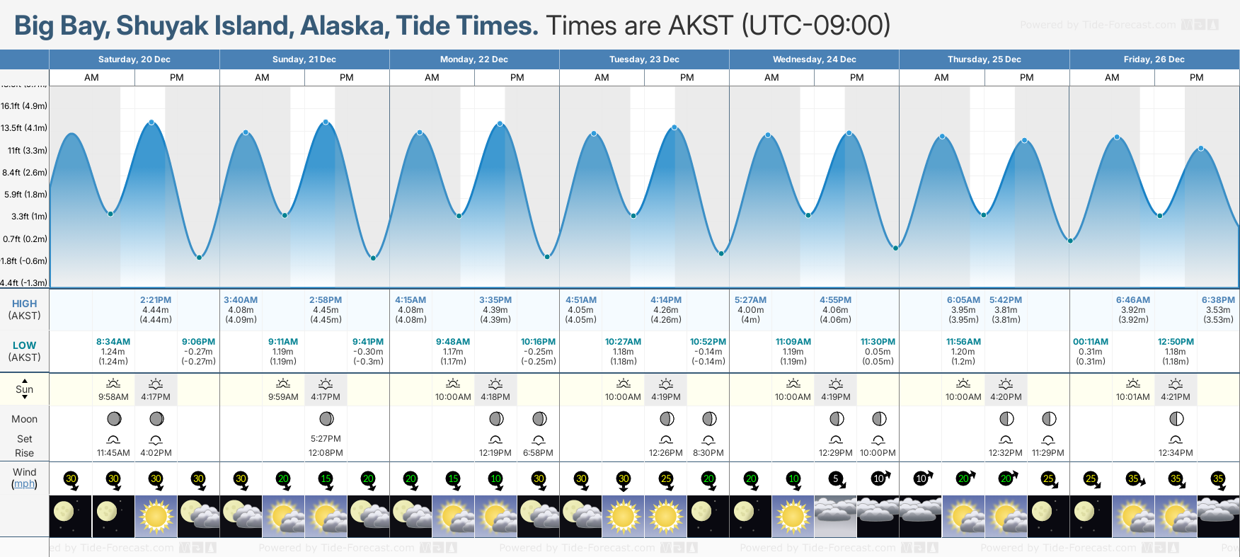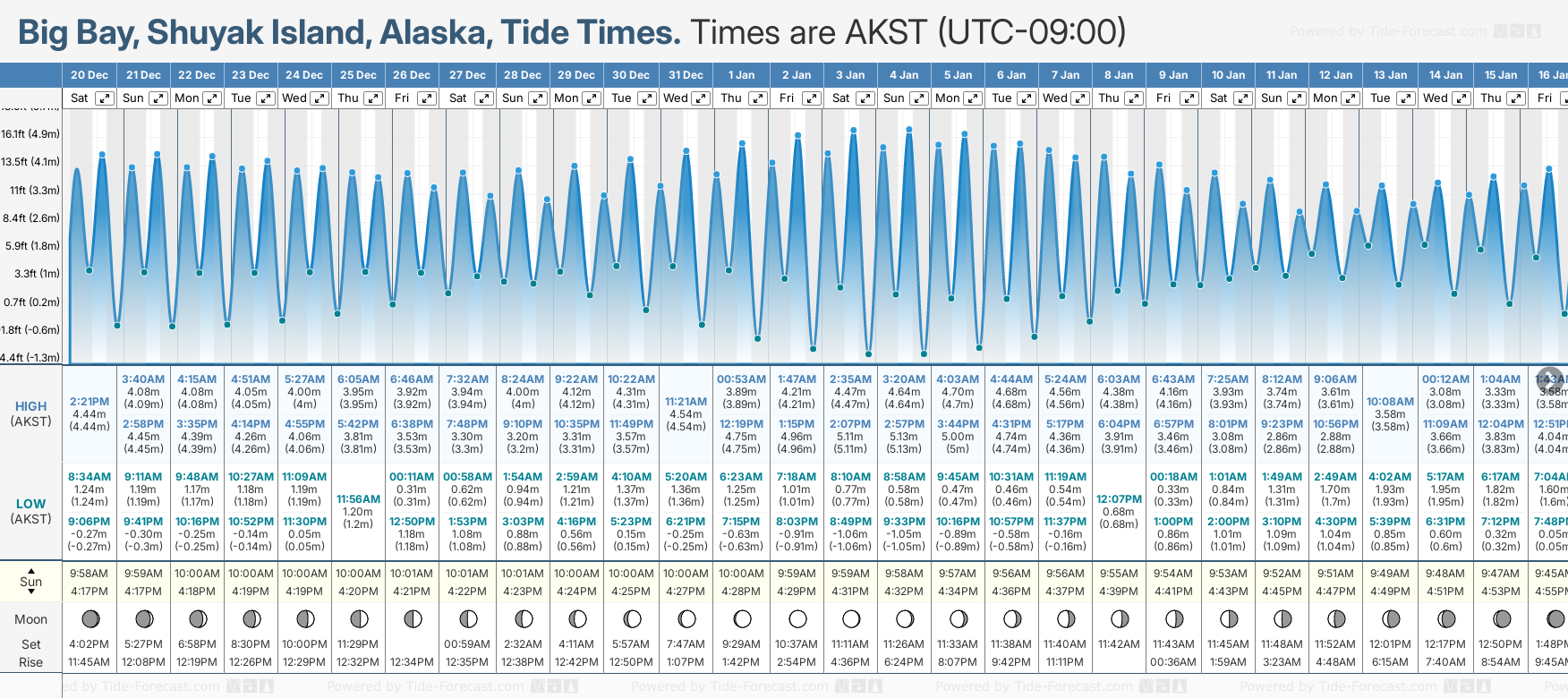 December and January Tide charts for Big Bay, Shuyak Island: The tide charts below show the height, time and date of high and low tides for the next 30 days.