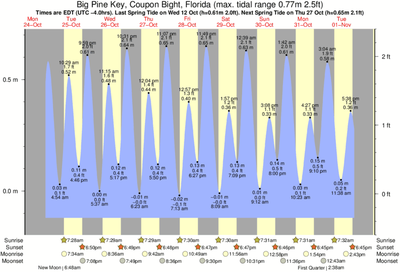 Tide Times are EST (UTC -5.0hrs). Last Spring High Tide at Big Pine Key, Coupon Bight was on Fri 05 Dec (height: 0.63m 2.1ft). Next high Spring Tide at Big Pine Key, Coupon Bight will be on Sun 21 Dec (height: 0.49m 1.6ft).