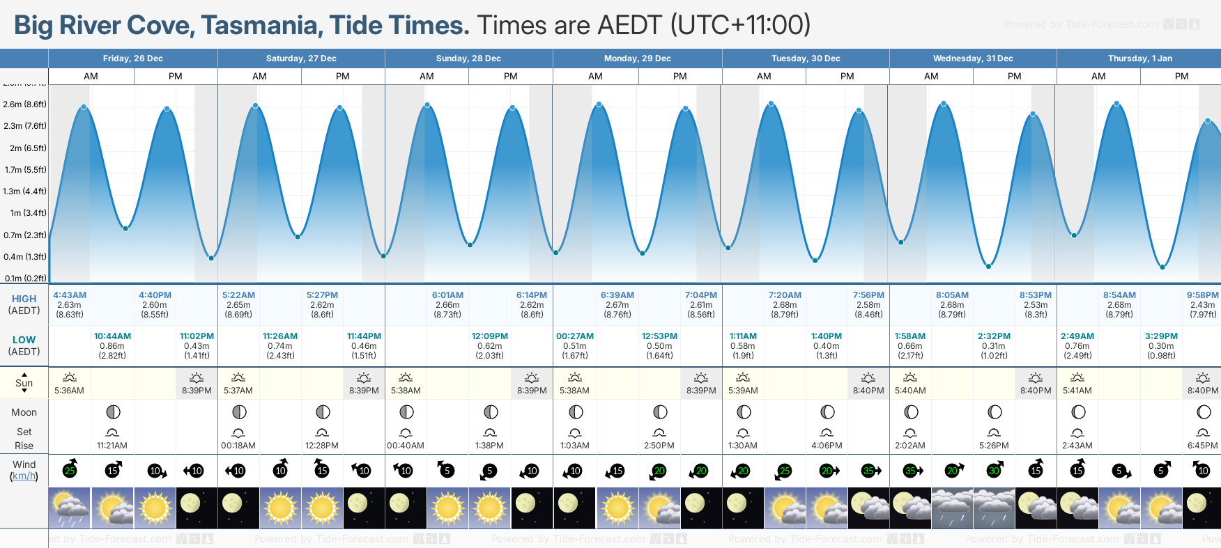 Tide chart for Big River CoveShowing low and high tide times for the next 30 days at Big River Cove. Tide Times are AEDT (UTC +11.0hrs).