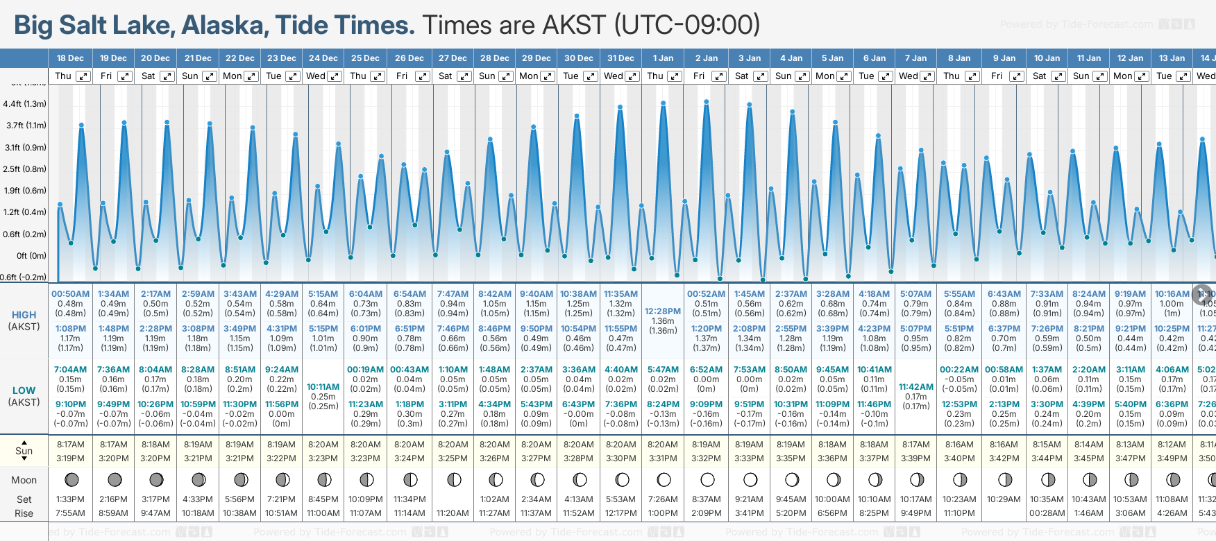 Tide Times are AKST (UTC -9.0hrs). Last Spring High Tide at Big Salt Lake was on Thu 04 Dec (height: 1.44m 4.7ft). Next high Spring Tide at Big Salt Lake will be on Fri 19 Dec (height: 1.19m 3.9ft).