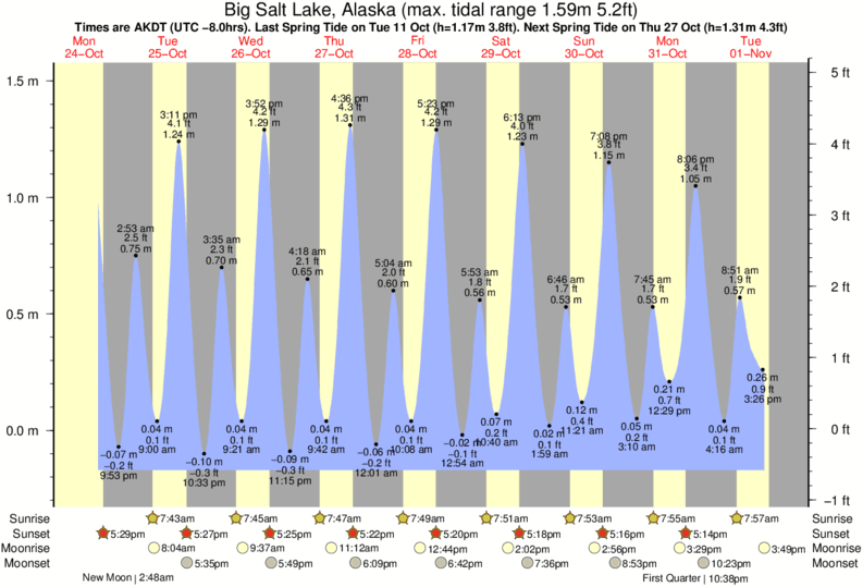 Tide Times are AKST (UTC -9.0hrs). Last Spring High Tide at Big Salt Lake was on Fri 19 Dec (height: 1.19m 3.9ft). Next high Spring Tide at Big Salt Lake will be on Fri 02 Jan (height: 1.37m 4.5ft).