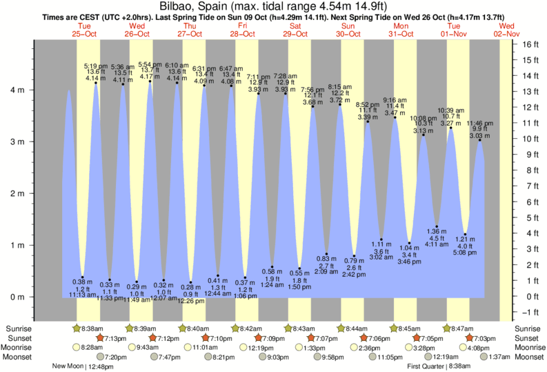 Tide Times are CET (UTC +1.0hrs). Last Spring High Tide at Bilbao was on Sat 06 Dec (height: 4.27m 14.0ft). Next high Spring Tide at Bilbao will be on Mon 22 Dec (height: 3.73m 12.2ft).