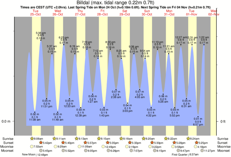 Tide Times are CET (UTC +1.0hrs). Last Spring High Tide at Billdal was on Fri 19 Dec (height: 0.20m 0.7ft). Next high Spring Tide at Billdal will be on Sat 03 Jan (height: 0.22m 0.7ft).