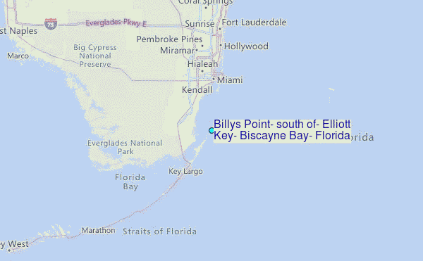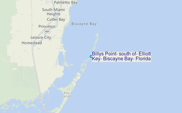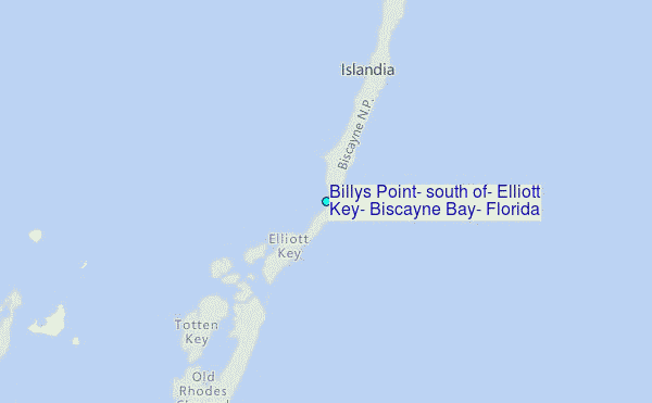 Use this relief map to navigate to tide stations, surf breaks and cities that are in the area of Billys Point, south of, Elliott Key, Biscayne Bay, Florida.