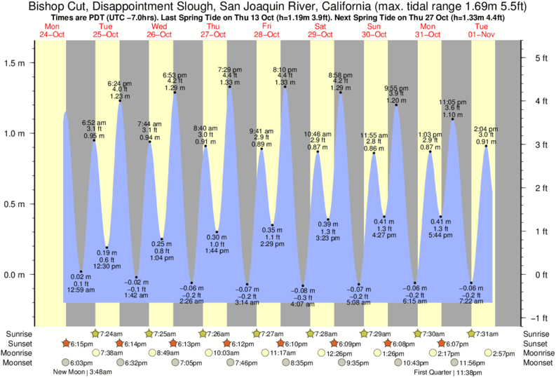 Bishop Cut, Disappointment Slough, San Joaquin River tide chart key: The tide chart above shows the height and times of high tide and low tide for Bishop Cut, Disappointment Slough, San Joaquin River, California. The grey shading corresponds to nighttime hours between sunset and sunrise at Bishop Cut, Disappointment Slough, San Joaquin River.