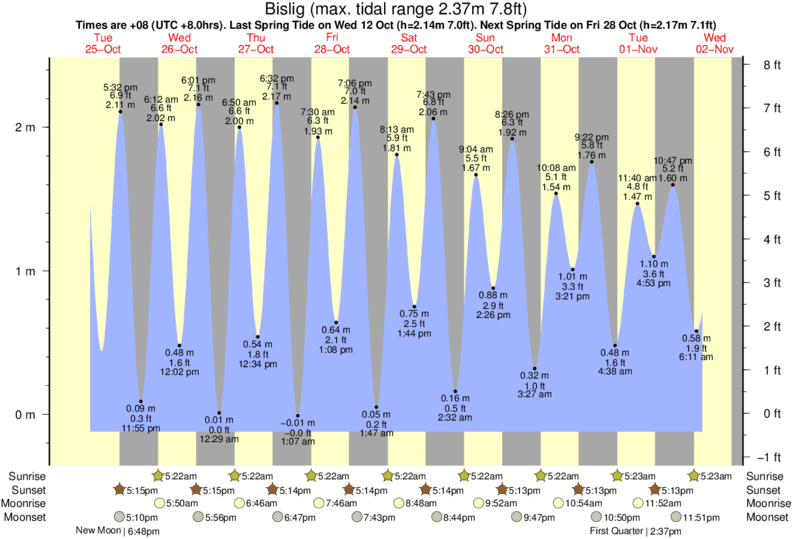 Tide chart for BisligShowing low and high tide times for the next 30 days at Bislig. Tide Times are PST (UTC +8.0hrs).