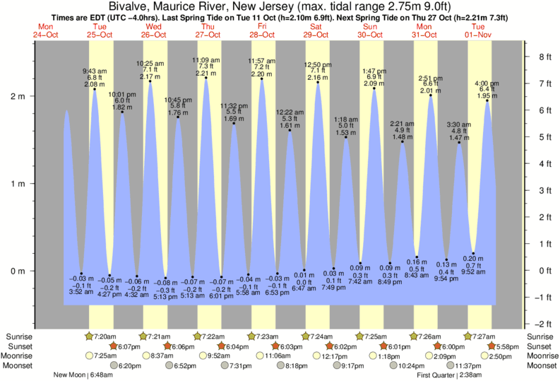 Bivalve, Maurice River tide chart key: The tide chart above shows the height and times of high tide and low tide for Bivalve, Maurice River, New Jersey. The grey shading corresponds to nighttime hours between sunset and sunrise at Bivalve, Maurice River.