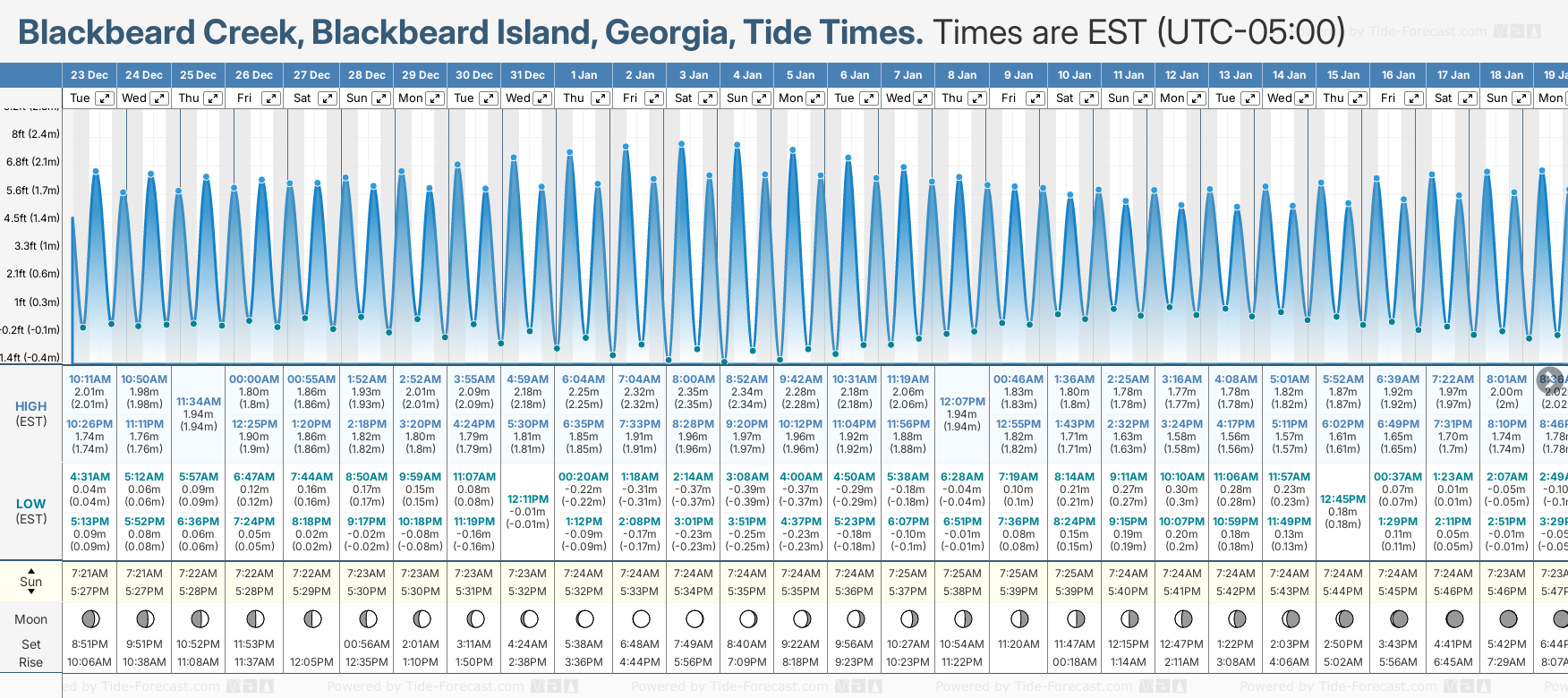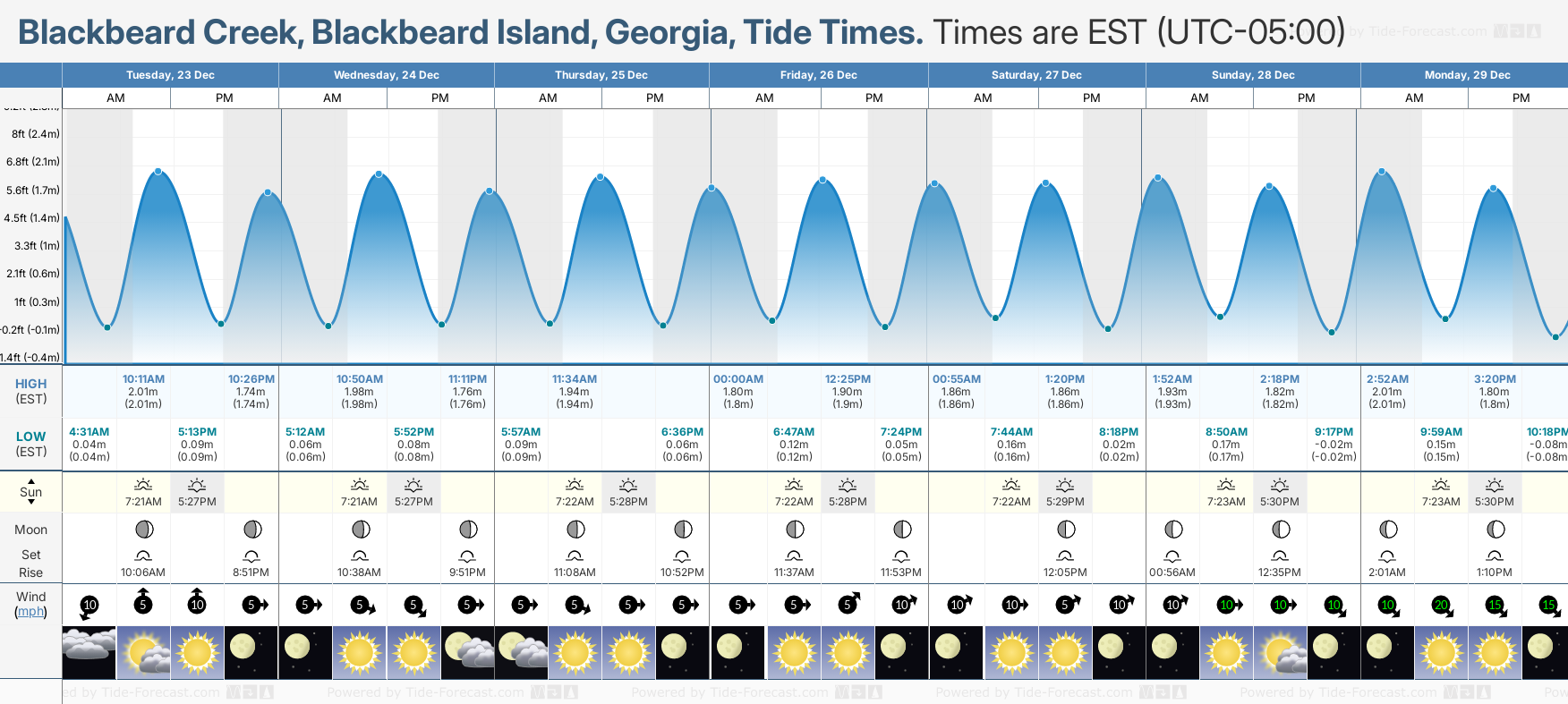 December and January Tide charts for Blackbeard Creek, Blackbeard Island: The tide charts below show the height, time and date of high and low tides for the next 30 days.
