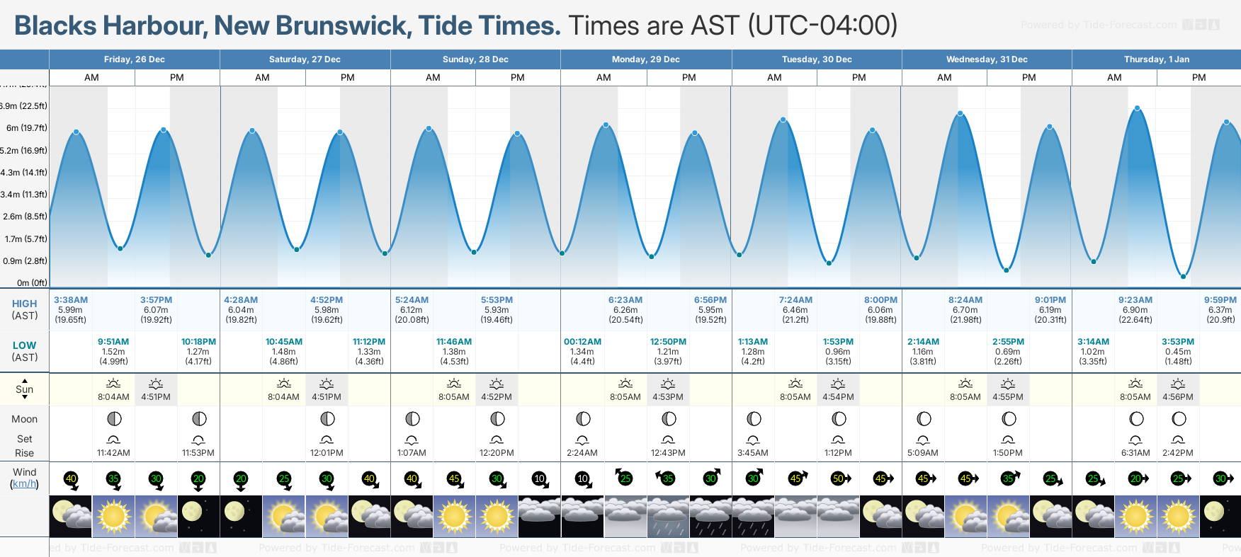 Tide Times are AST (UTC -4.0hrs). Last Spring High Tide at Blacks Harbour was on Mon 22 Dec (height: 6.28m 20.6ft). Next high Spring Tide at Blacks Harbour will be on Sat 03 Jan (height: 7.19m 23.6ft).