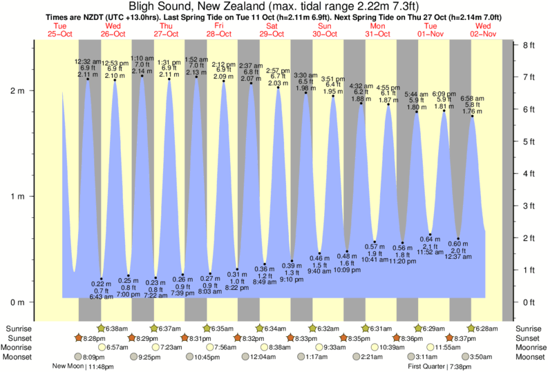 Tide Times are NZDT (UTC +13.0hrs). Last Spring High Tide at Bligh Sound was on Sun 07 Dec (height: 2.18m 7.2ft). Next high Spring Tide at Bligh Sound will be on Mon 22 Dec (height: 1.98m 6.5ft).