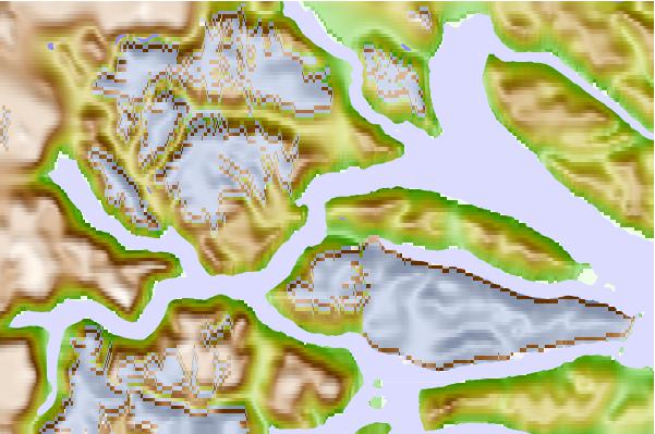 Use this relief map to navigate to tide stations, surf breaks and cities that are in the area of Blomsterbugten, Greenland.