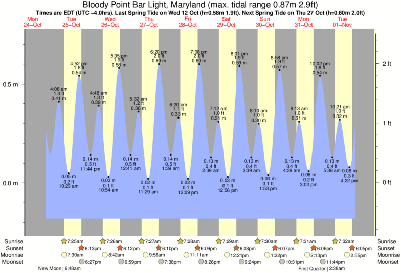Tide Times are EST (UTC -5.0hrs). Last Spring High Tide at Bloody Point Bar Light was on Fri 19 Dec (height: 0.40m 1.3ft). Next high Spring Tide at Bloody Point Bar Light will be on Thu 01 Jan (height: 0.45m 1.5ft).