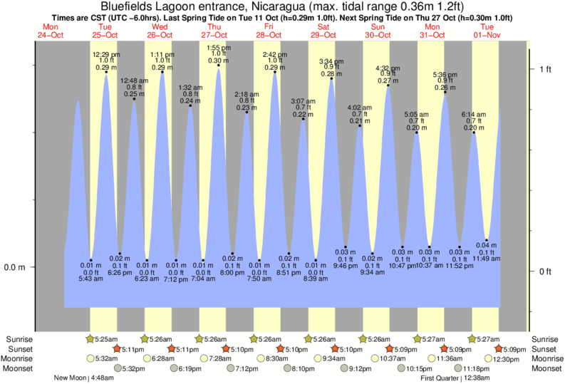 Bluefields tide chart key: The tide chart above shows the height and times of high tide and low tide for Bluefields Lagoon entrance, Nicaragua. The grey shading corresponds to nighttime hours between sunset and sunrise at Bluefields.