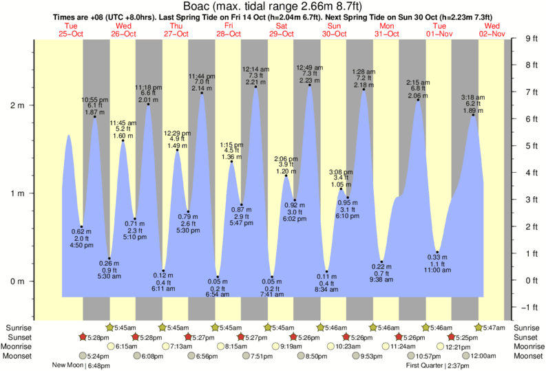 December and January Tide charts for Boac: The tide charts below show the height, time and date of high and low tides for the next 30 days.