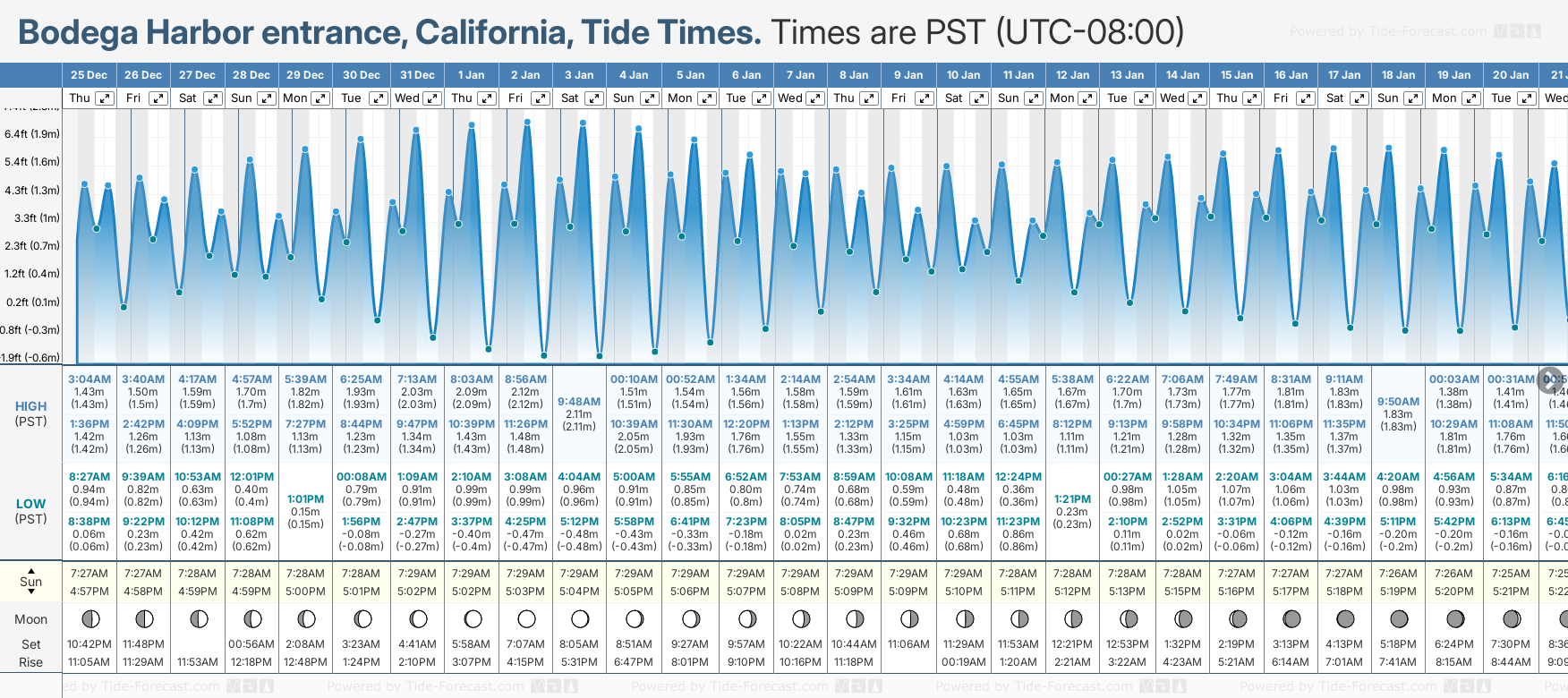 December and January Tide charts for Bodega Bay: The tide charts below show the height, time and date of high and low tides for the next 30 days.