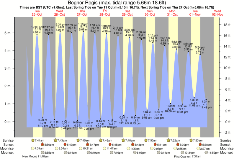 Tide Times are GMT (UTC +0hrs). Last Spring High Tide at Bognor Regis was on Sun 07 Dec (height: 5.16m 16.9ft). Next high Spring Tide at Bognor Regis will be on Mon 22 Dec (height: 4.48m 14.7ft).