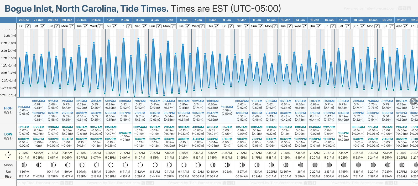 December and January Tide charts for Bogue Inlet: The tide charts below show the height, time and date of high and low tides for the next 30 days.