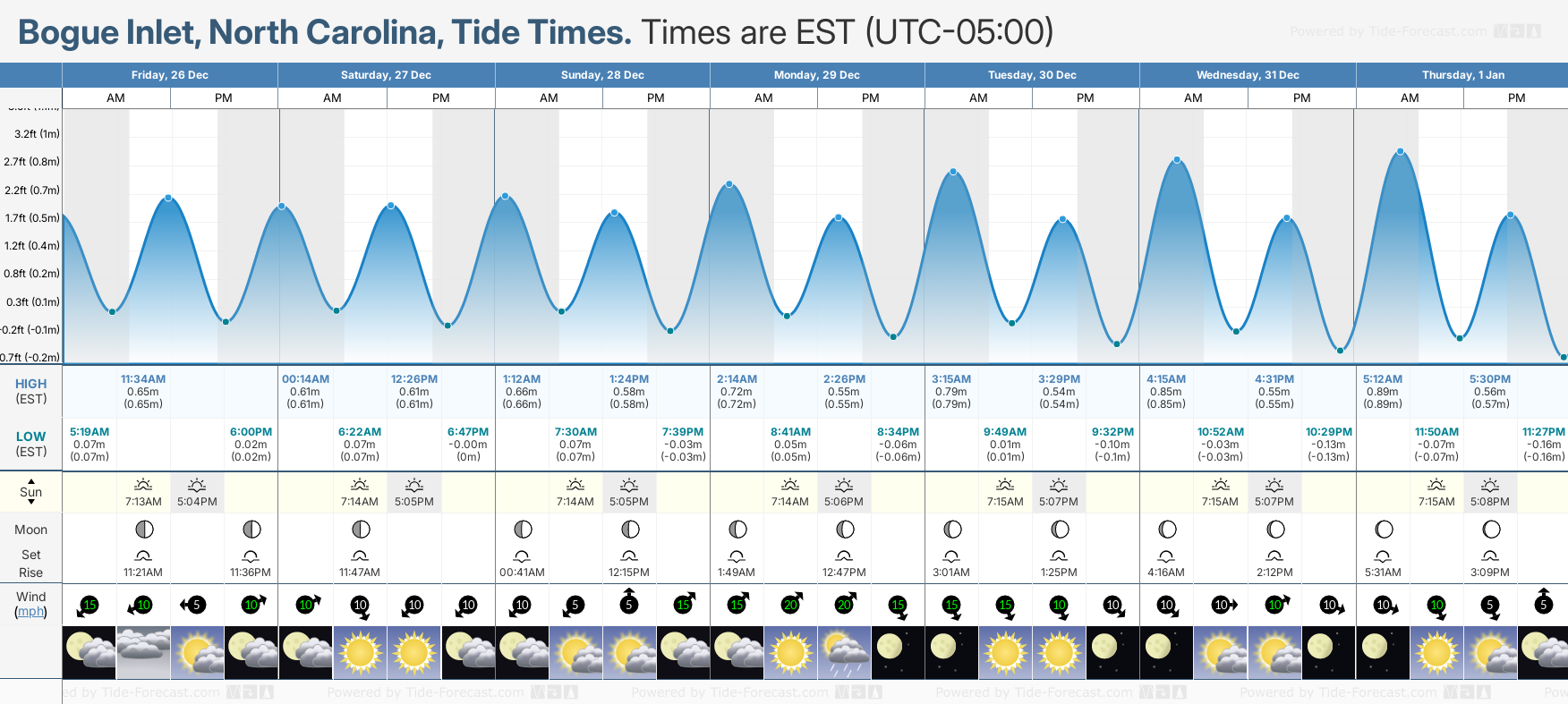 Tide chart for Bogue InletShowing low and high tide times for the next 30 days at Bogue Inlet. Tide Times are EST (UTC -5.0hrs).