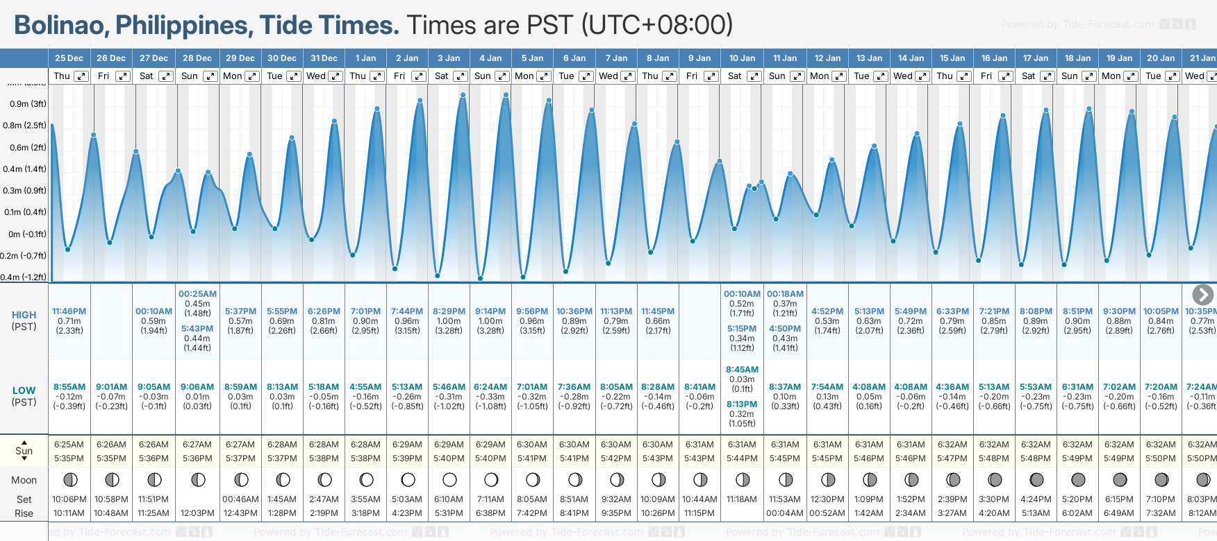 December and January Tide charts for Bolinao: The tide charts below show the height, time and date of high and low tides for the next 30 days.