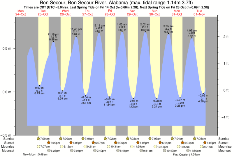 Tide chart for Bon Secour, Bon Secour RiverShowing low and high tide times for the next 30 days at Bon Secour, Bon Secour River. Tide Times are CST (UTC -6.0hrs).