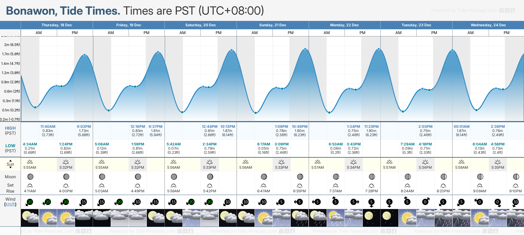 Tide Times are PST (UTC +8.0hrs). Last Spring High Tide at Bonawon was on Sun 07 Dec (height: 2.15m 7.1ft). Next high Spring Tide at Bonawon will be on Mon 22 Dec (height: 1.90m 6.2ft).
