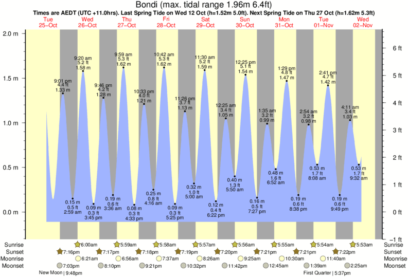 Tide Times are AEDT (UTC +11.0hrs). Last Spring High Tide at Bondi was on Sat 06 Dec (height: 1.82m 6.0ft). Next high Spring Tide at Bondi will be on Sun 21 Dec (height: 1.56m 5.1ft).