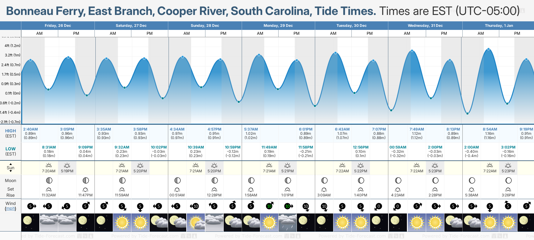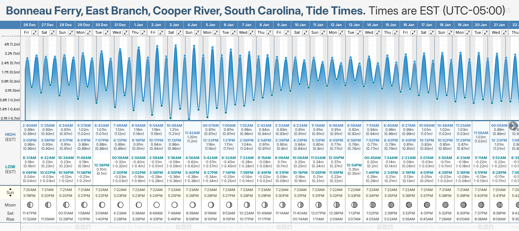 December and January Tide charts for Bonneau Ferry, East Branch, Cooper River: The tide charts below show the height, time and date of high and low tides for the next 30 days.