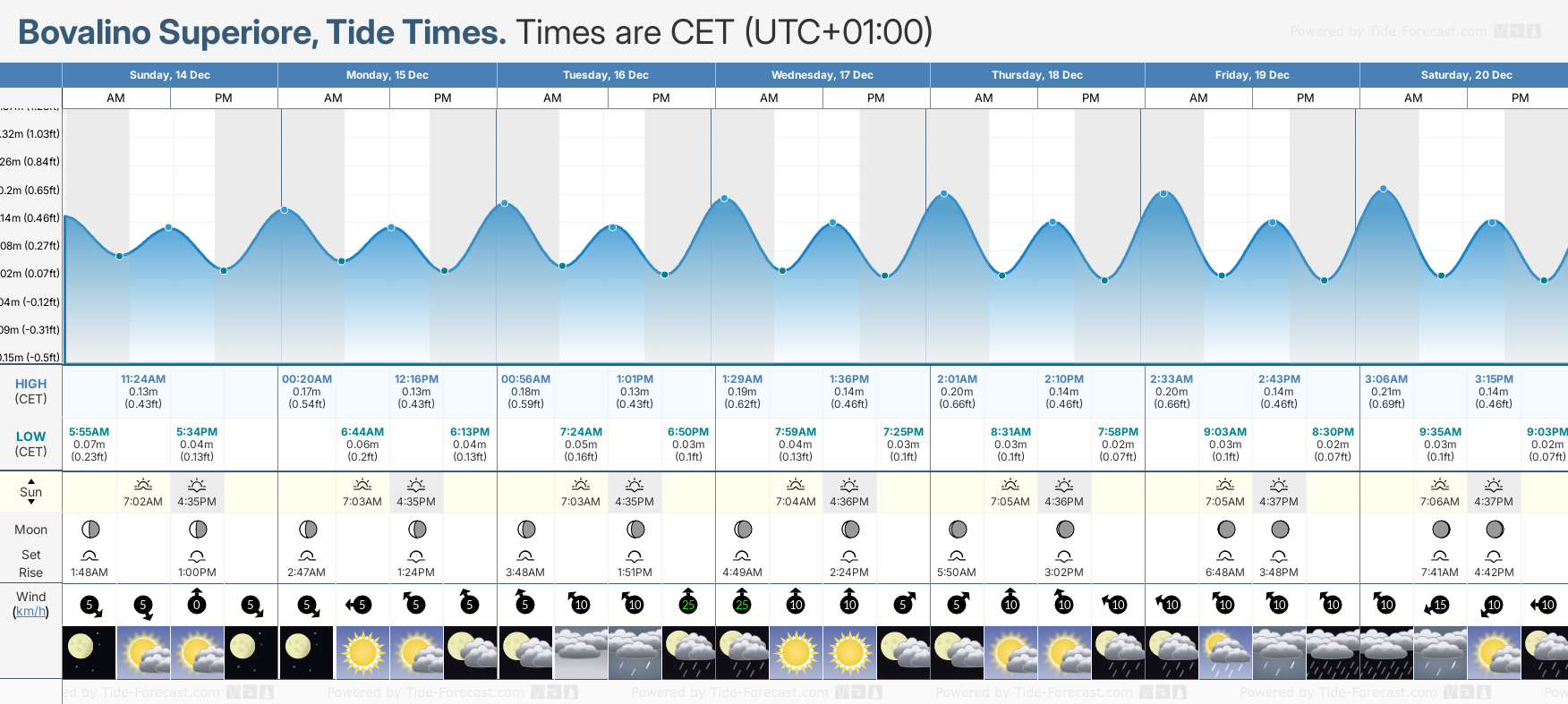 Tide Times are CET (UTC +1.0hrs). Last Spring High Tide at Bovalino Superiore was on Sat 06 Dec (height: 0.23m 0.8ft). Next high Spring Tide at Bovalino Superiore will be on Sat 20 Dec (height: 0.21m 0.7ft).