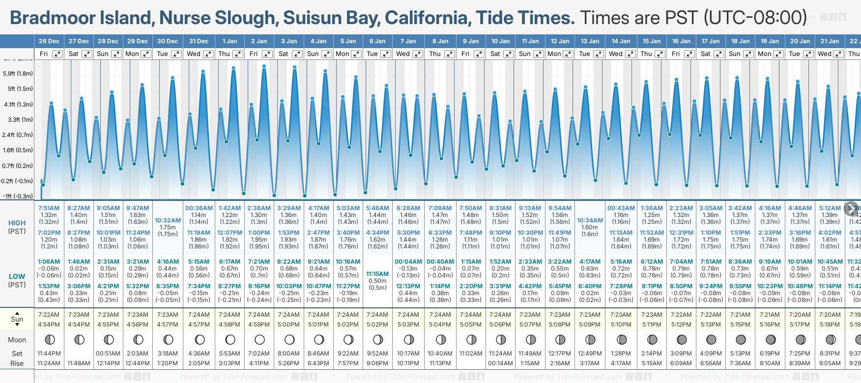 December and January Tide charts for Bradmoor Island, Nurse Slough, Suisun Bay: The tide charts below show the height, time and date of high and low tides for the next 30 days.