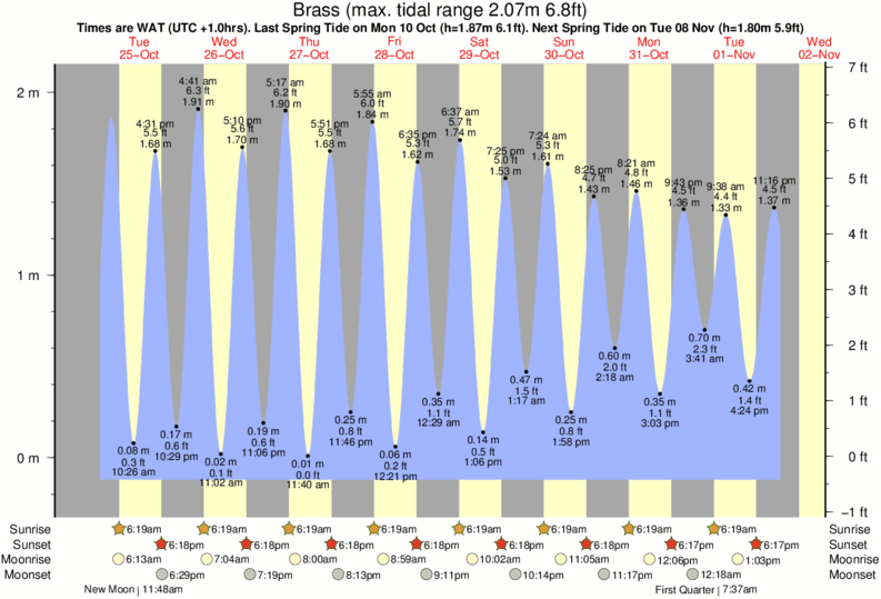 Tide Times are WAT (UTC +1.0hrs). Last Spring High Tide at Brass was on Fri 05 Dec (height: 1.87m 6.1ft). Next high Spring Tide at Brass will be on Mon 22 Dec (height: 1.60m 5.2ft).