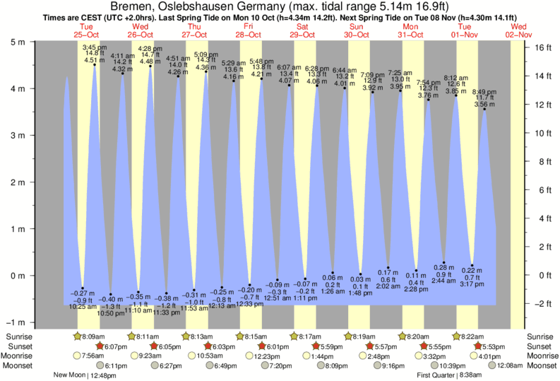 Tide Times are CET (UTC +1.0hrs). Last Spring High Tide at Bremen, Oslebshausen Germany was on Thu 11 Dec (height: 4.11m 13.5ft). Next high Spring Tide at Bremen, Oslebshausen Germany will be on Sat 27 Dec (height: 4.16m 13.6ft).