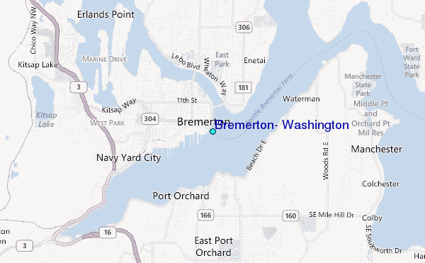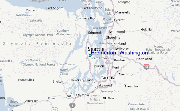 Use this relief map to navigate to tide stations, surf breaks and cities that are in the area of Bremerton, Washington.