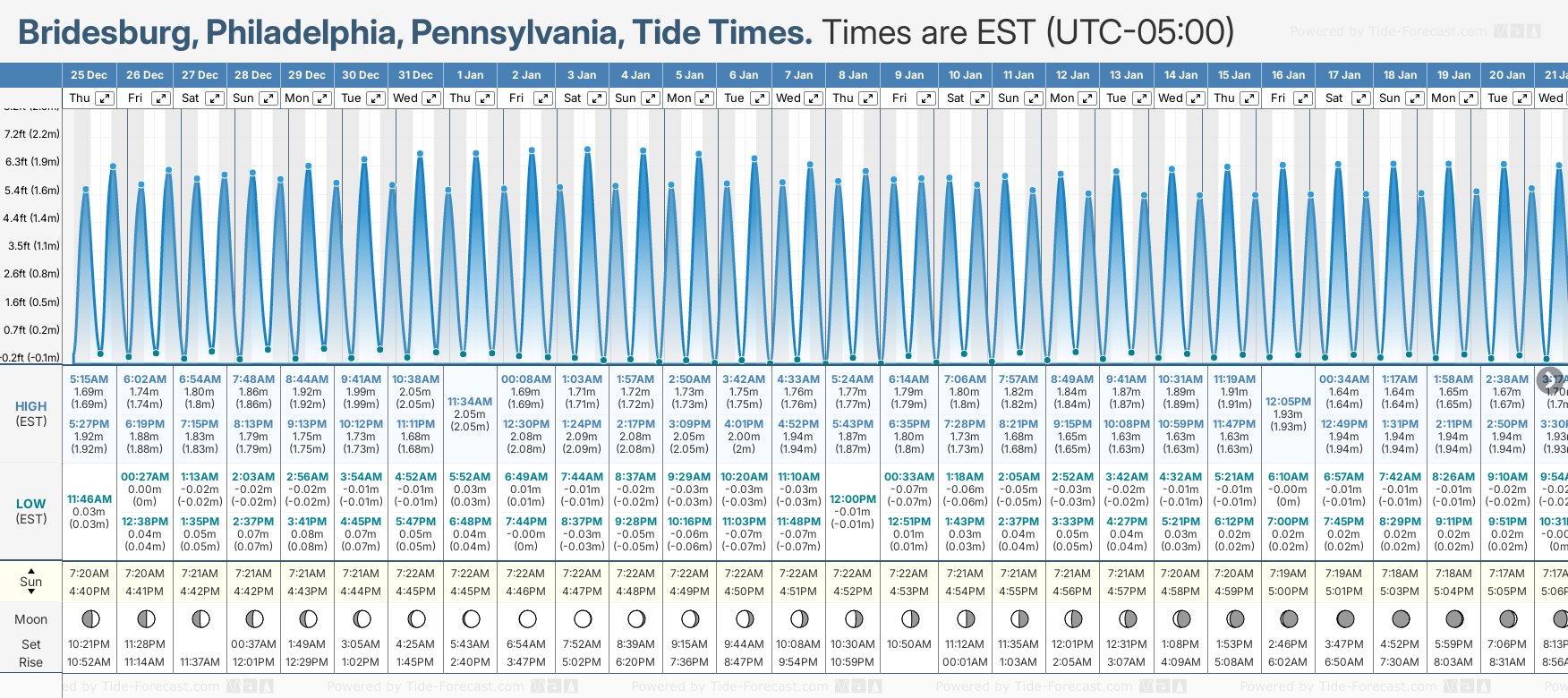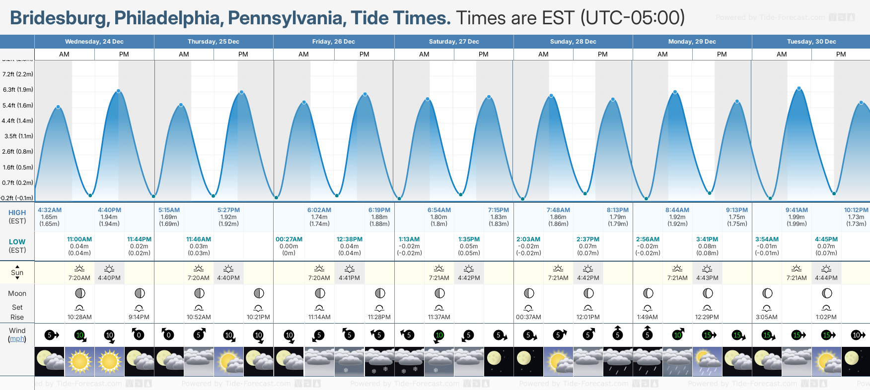 Tide chart for Bridesburg, PhiladelphiaShowing low and high tide times for the next 30 days at Bridesburg, Philadelphia. Tide Times are EST (UTC -5.0hrs).