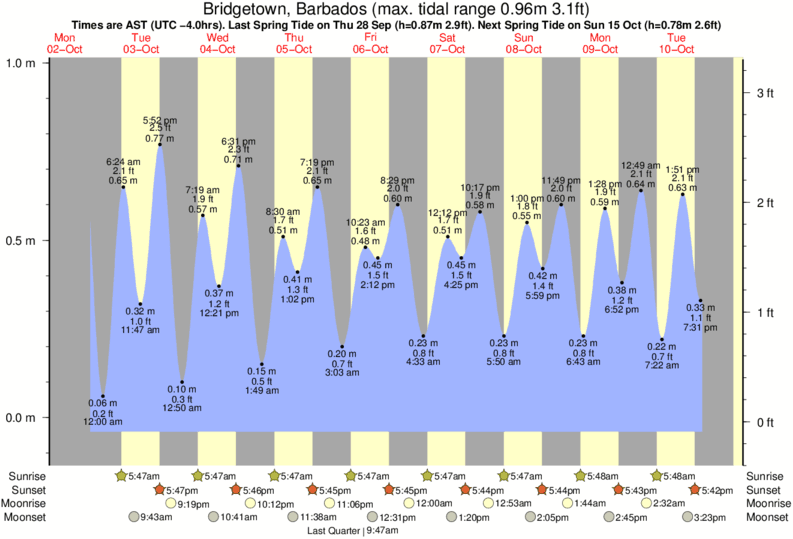 Tide chart for Bridgetown, BarbadosShowing low and high tide times for the next 30 days at Bridgetown, Barbados. Tide Times are AST (UTC -4.0hrs).