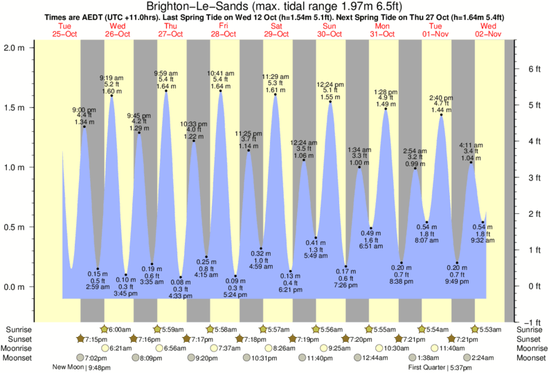 December and January Tide charts for Brighton-Le-Sands: The tide charts below show the height, time and date of high and low tides for the next 30 days.