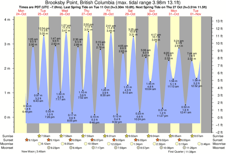 Tide Times are PST (UTC -8.0hrs). Last Spring High Tide at Brooksby Point was on Fri 05 Dec (height: 3.77m 12.4ft). Next high Spring Tide at Brooksby Point will be on Sun 21 Dec (height: 3.23m 10.6ft).