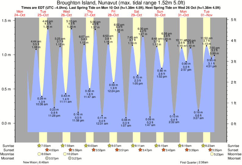 Tide Times are EST (UTC -5.0hrs). Last Spring High Tide at Broughton Island was on Thu 18 Dec (height: 1.27m 4.2ft). Next high Spring Tide at Broughton Island will be on Tue 30 Dec (height: 1.29m 4.2ft).