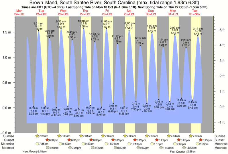 Tide Times are EST (UTC -5.0hrs). Last Spring High Tide at Brown Island, South Santee River was on Fri 19 Dec (height: 1.33m 4.4ft). Next high Spring Tide at Brown Island, South Santee River will be on Sat 03 Jan (height: 1.50m 4.9ft).