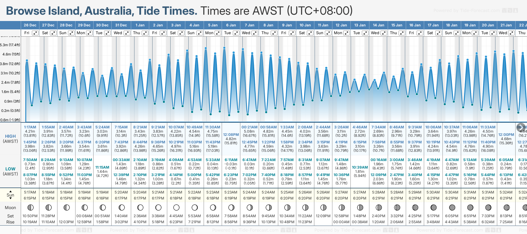Tide Times are AWST (UTC +8.0hrs). Last Spring High Tide at Browse Island was on Tue 23 Dec (height: 4.70m 15.4ft). Next high Spring Tide at Browse Island will be on Tue 06 Jan (height: 5.19m 17.0ft).