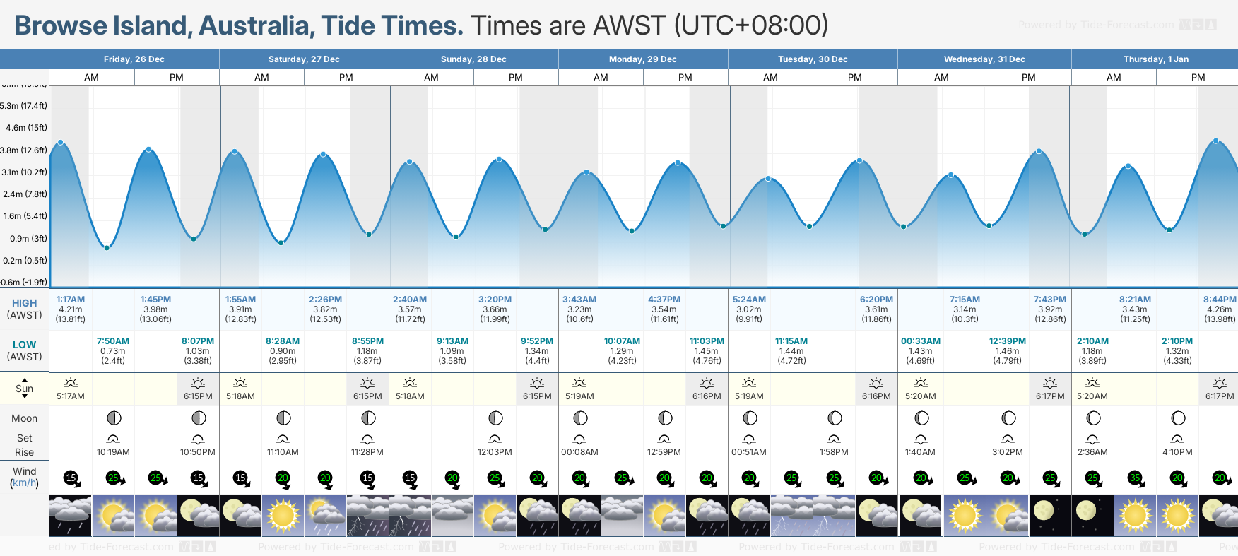 December and January Tide charts for Browse Island: The tide charts below show the height, time and date of high and low tides for the next 30 days.