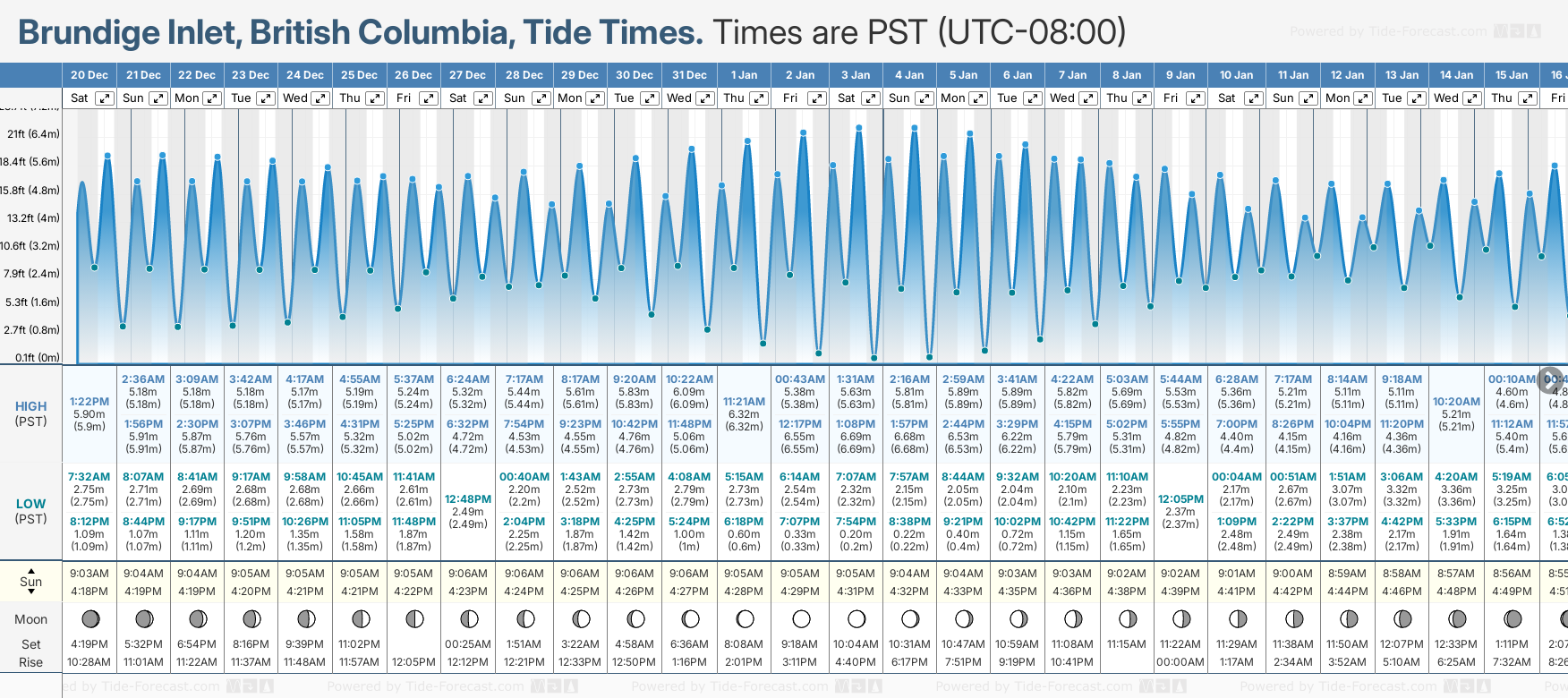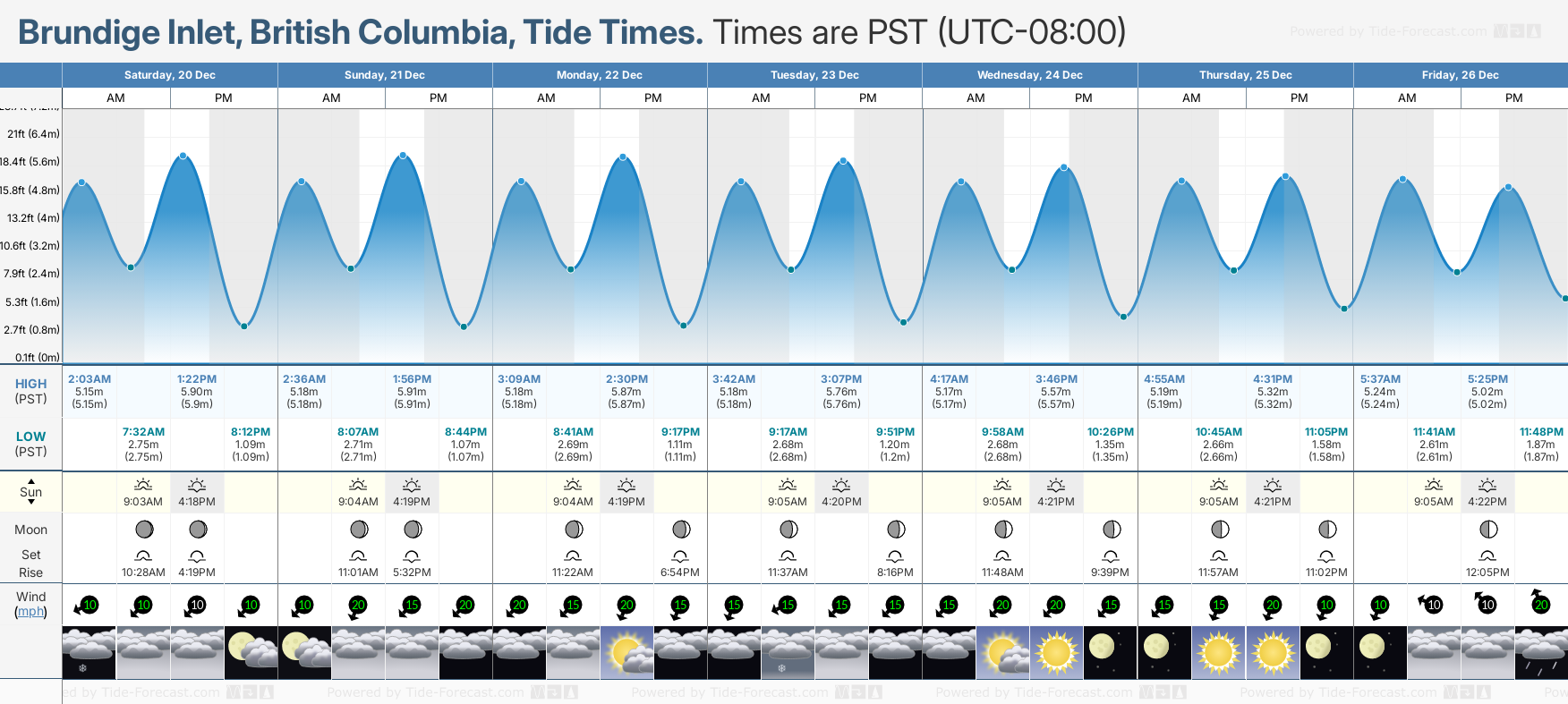 Tide Times are PST (UTC -8.0hrs). Last Spring High Tide at Brundige Inlet was on Fri 05 Dec (height: 6.83m 22.4ft). Next high Spring Tide at Brundige Inlet will be on Sun 21 Dec (height: 5.91m 19.4ft).