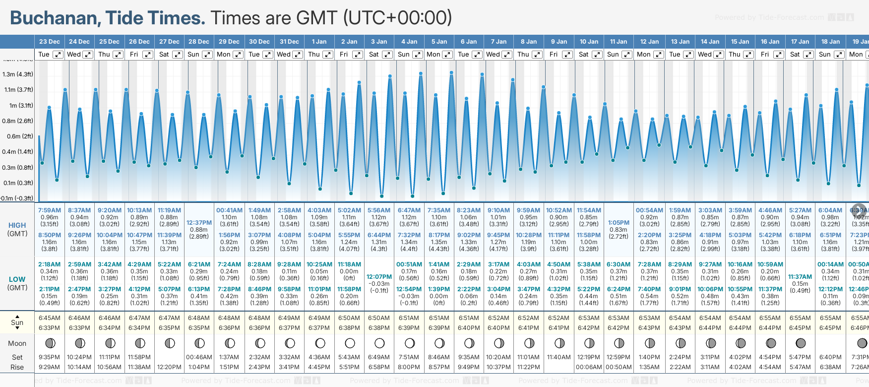 Tide Times are GMT (UTC +0hrs). Last Spring High Tide at Buchanan was on Sat 06 Dec (height: 1.31m 4.3ft). Next high Spring Tide at Buchanan will be on Tue 23 Dec (height: 1.16m 3.8ft).