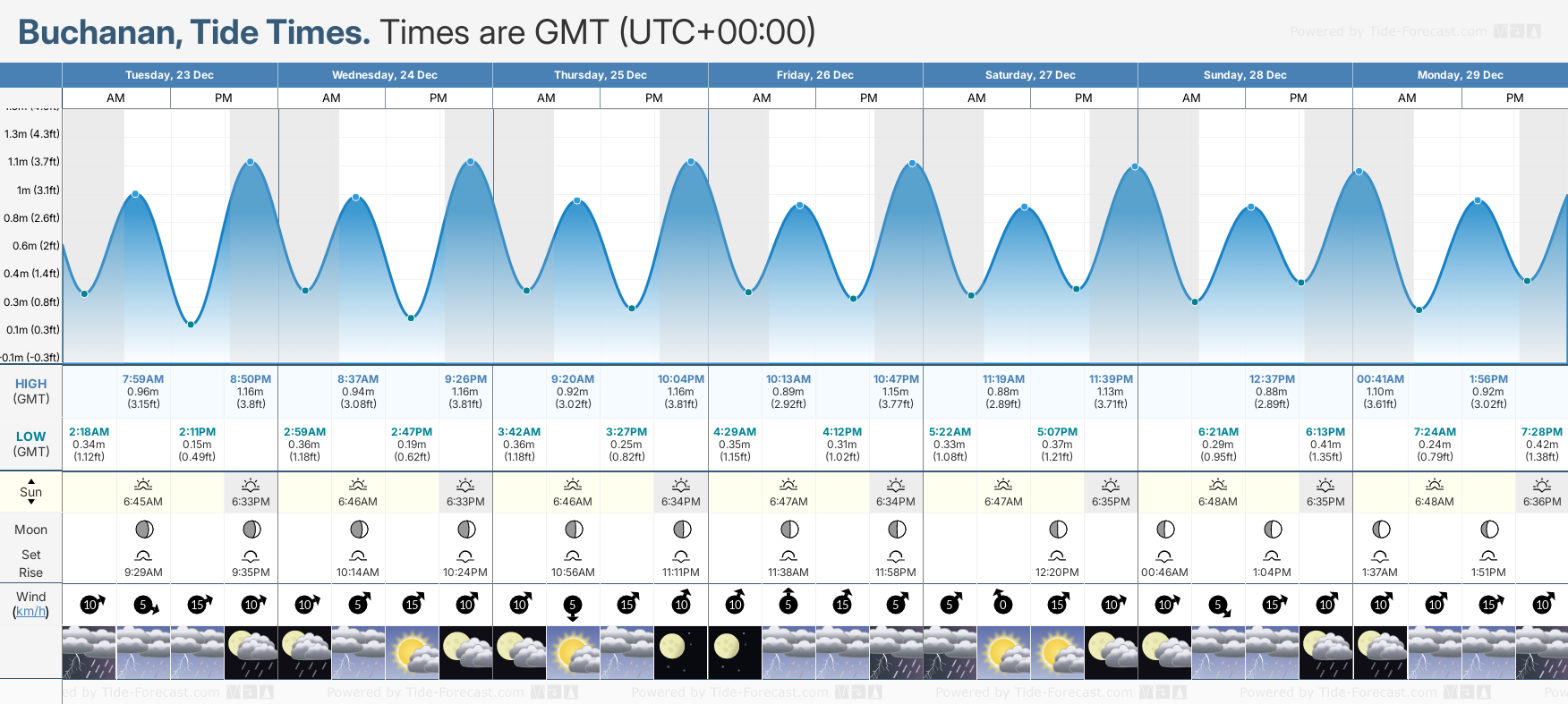 December and January Tide charts for Buchanan: The tide charts below show the height, time and date of high and low tides for the next 30 days.