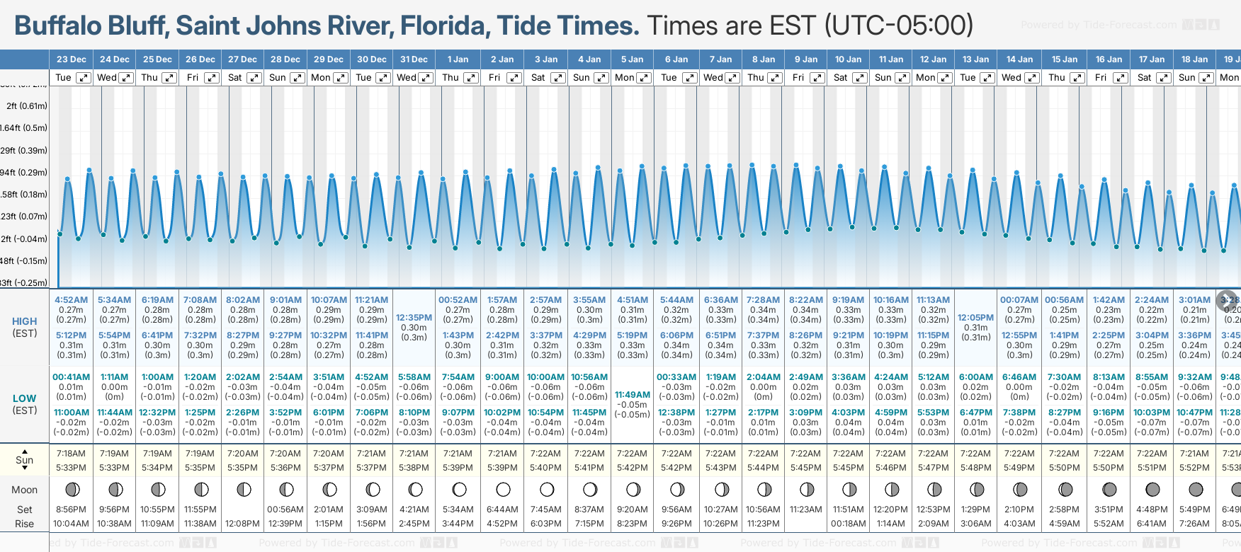 December and January Tide charts for Buffalo Bluff, Saint Johns River: The tide charts below show the height, time and date of high and low tides for the next 30 days.