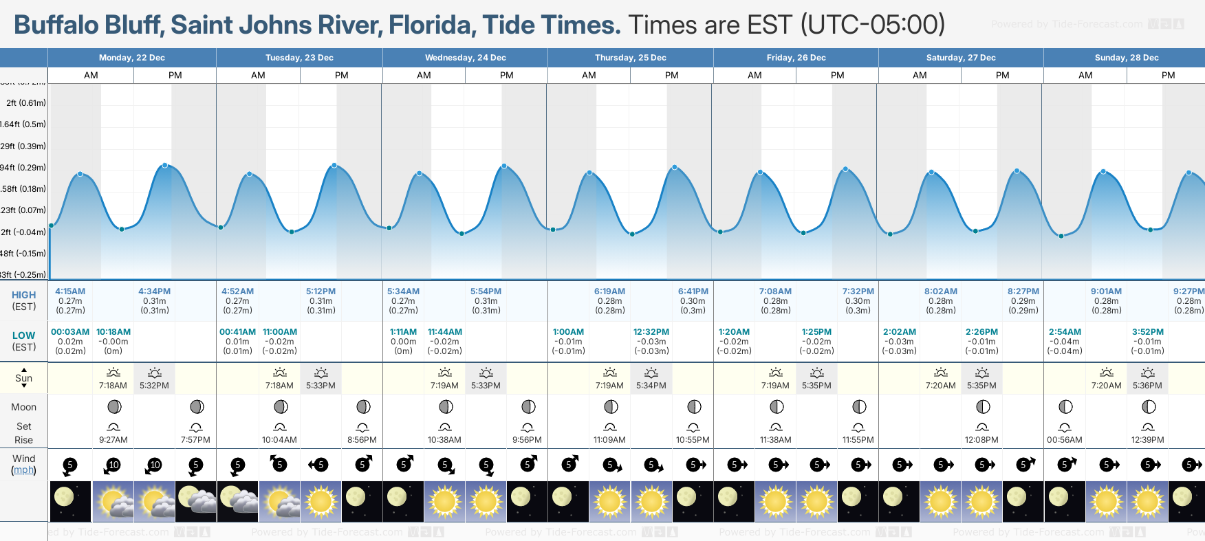 The predicted tide times today on Monday 22 December 2025 for Buffalo Bluff, Saint Johns River are: first low tide at 00:03am, first high tide at 4:15am, second low tide at 10:18am, second high tide at 4:34pm. Sunrise is at 7:18am and sunset is at 5:32pm.