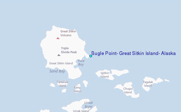Use this relief map to navigate to tide stations, surf breaks and cities that are in the area of Bugle Point, Great Sitkin Island, Alaska.
