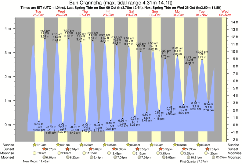 December and January Tide charts for Bun Cranncha: The tide charts below show the height, time and date of high and low tides for the next 30 days.