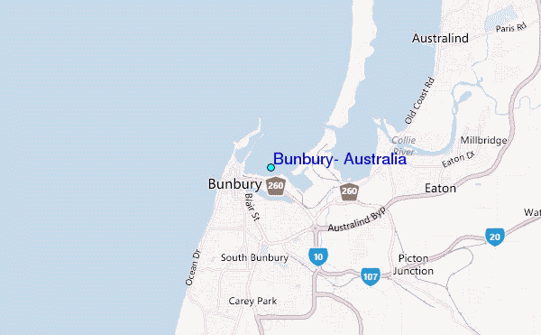 Use this relief map to navigate to tide stations, surf breaks and cities that are in the area of Bunbury, Australia.