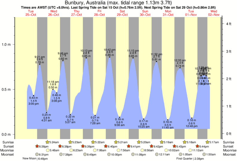 Tide Times are AWST (UTC +8.0hrs). Last Spring High Tide at Bunbury was on Sat 06 Dec (height: 0.96m 3.1ft). Next high Spring Tide at Bunbury will be on Sat 03 Jan (height: 0.97m 3.2ft).