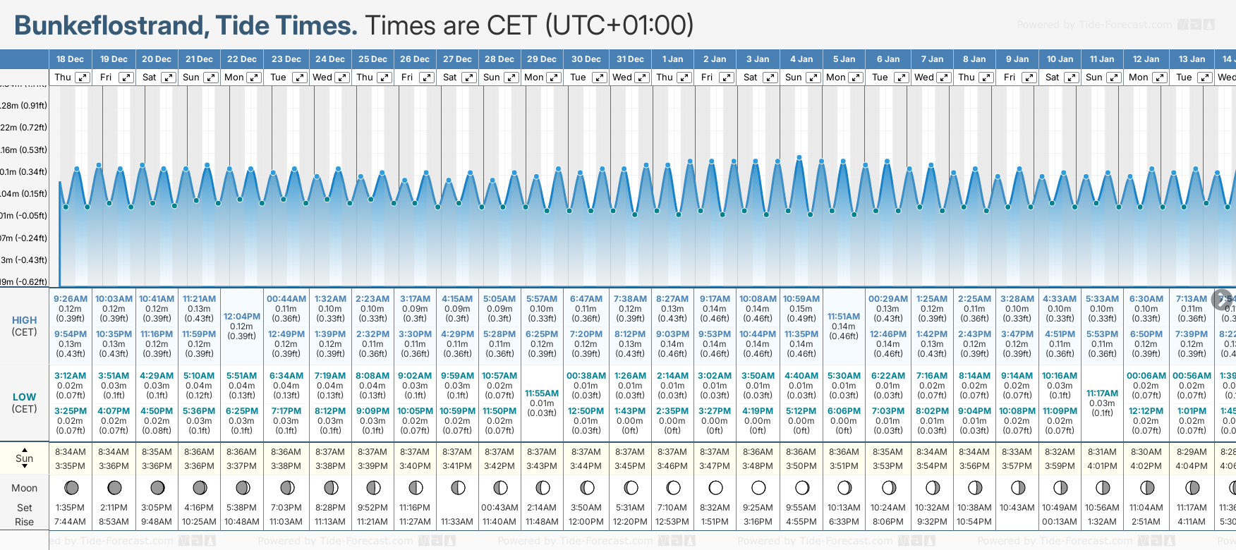 December and January Tide charts for Bunkeflostrand: The tide charts below show the height, time and date of high and low tides for the next 30 days.